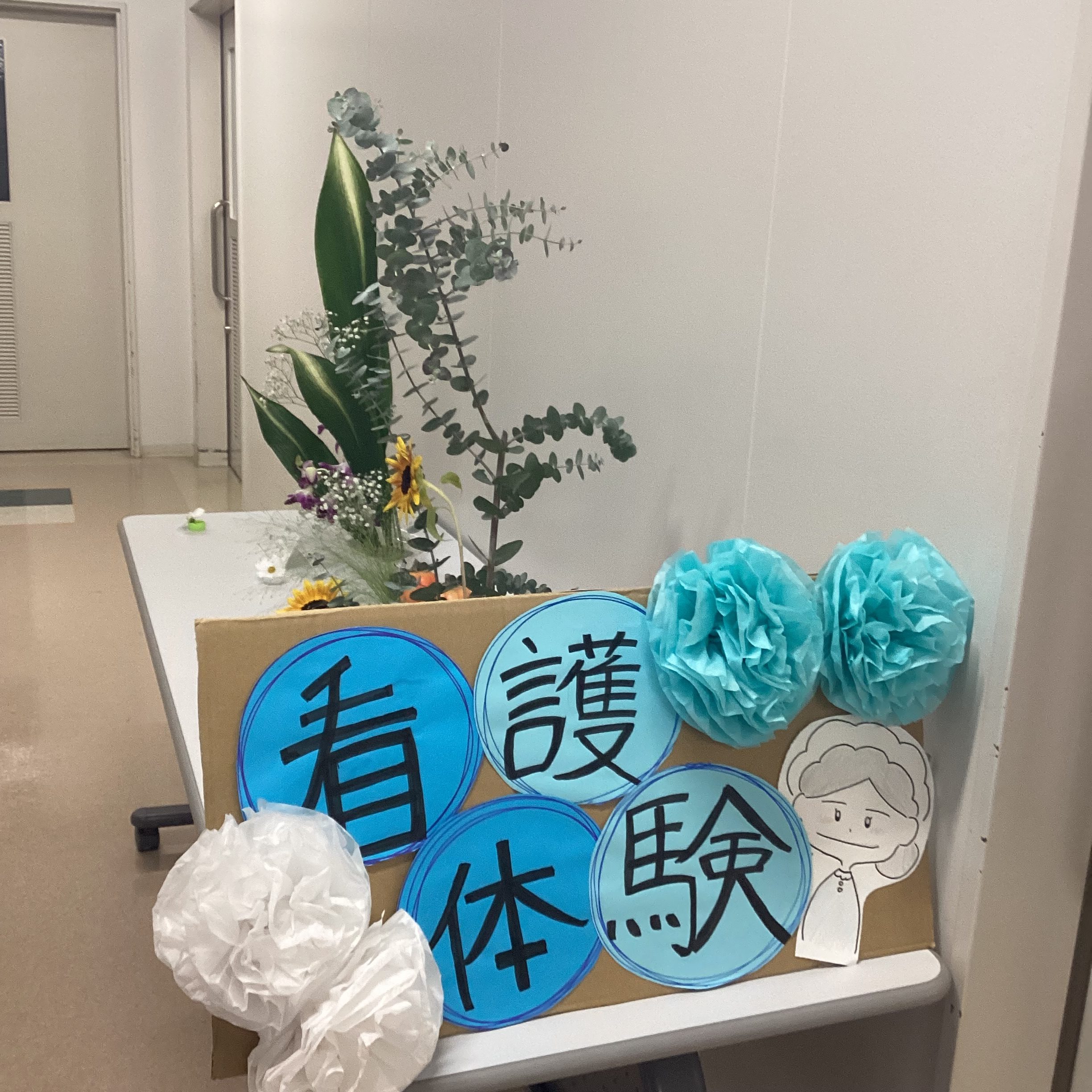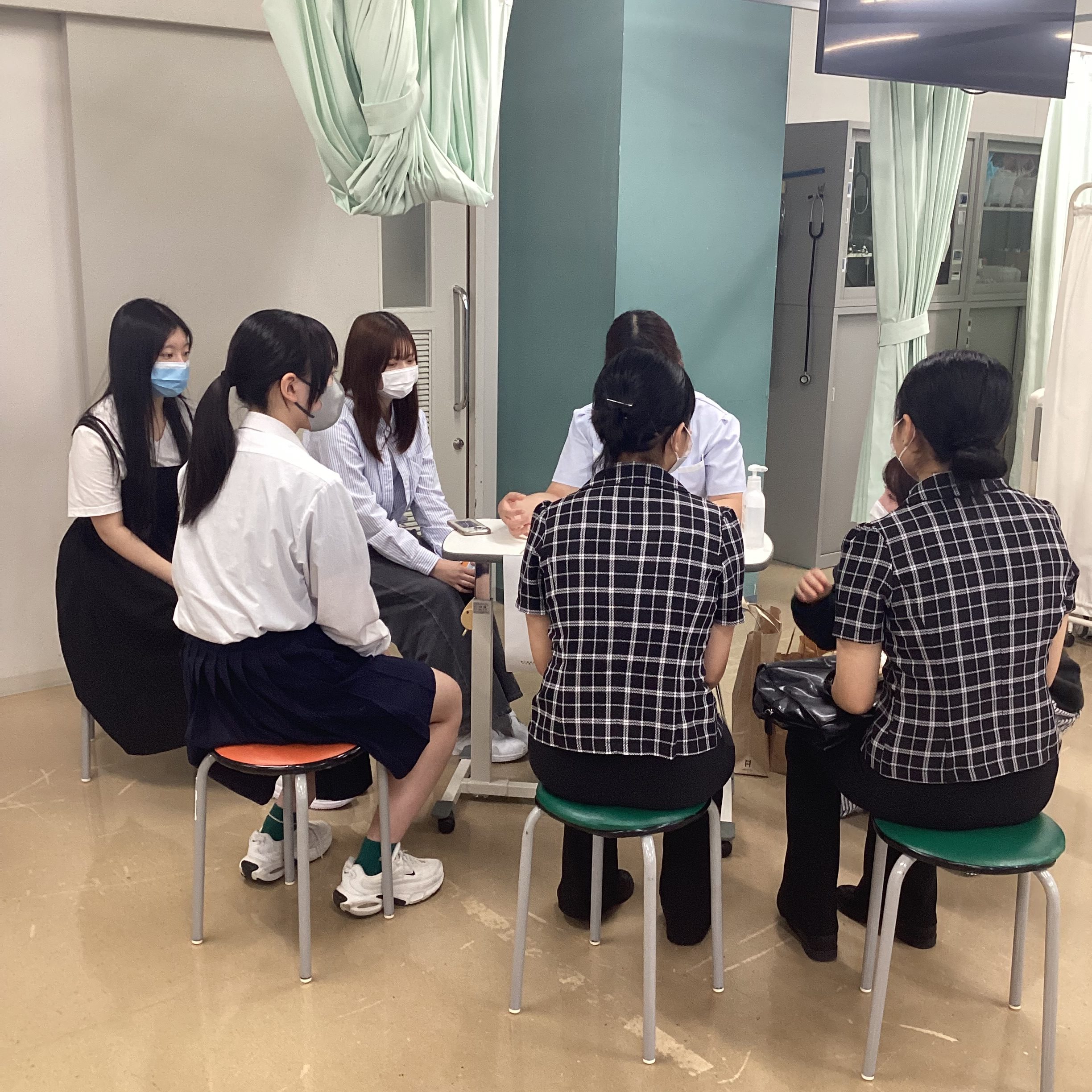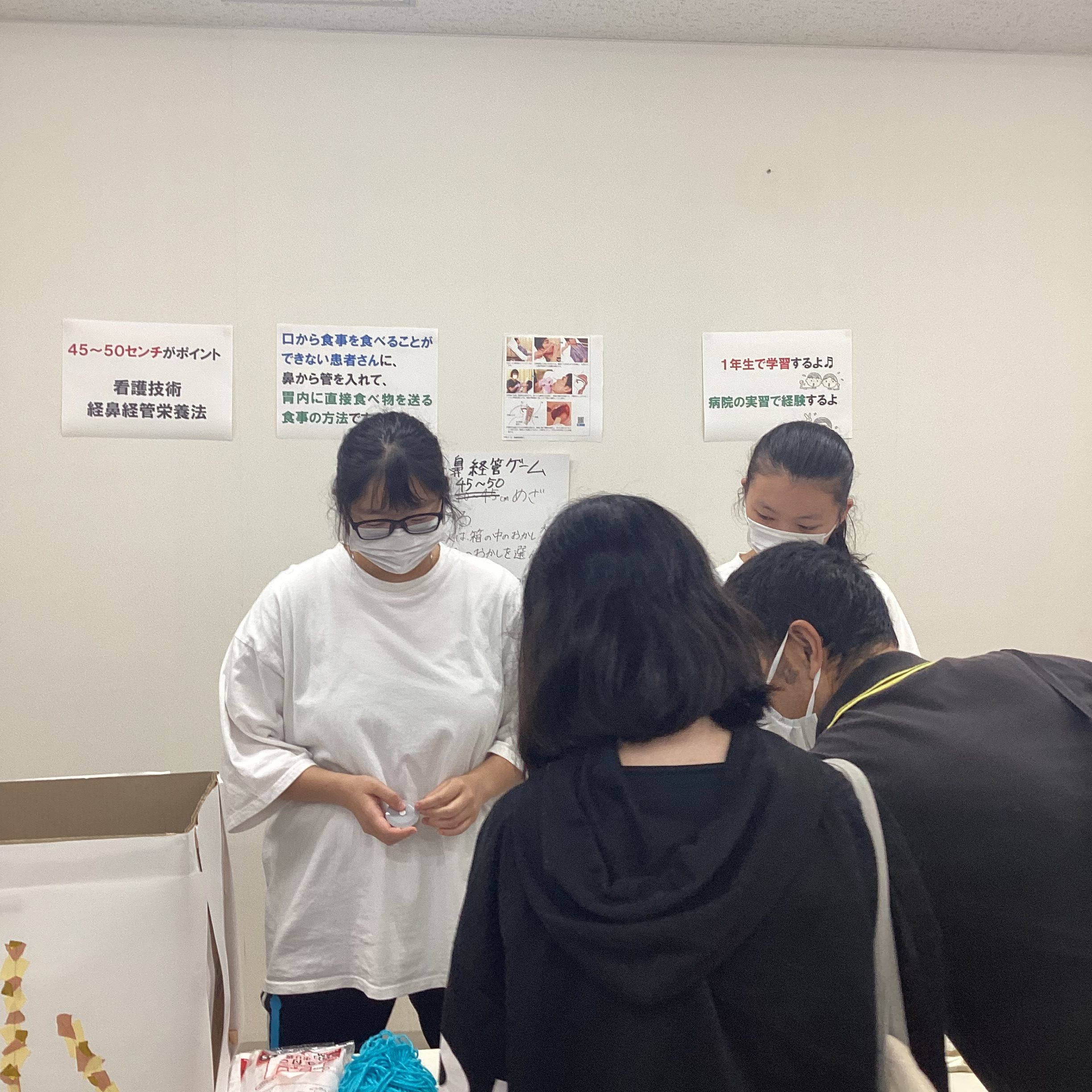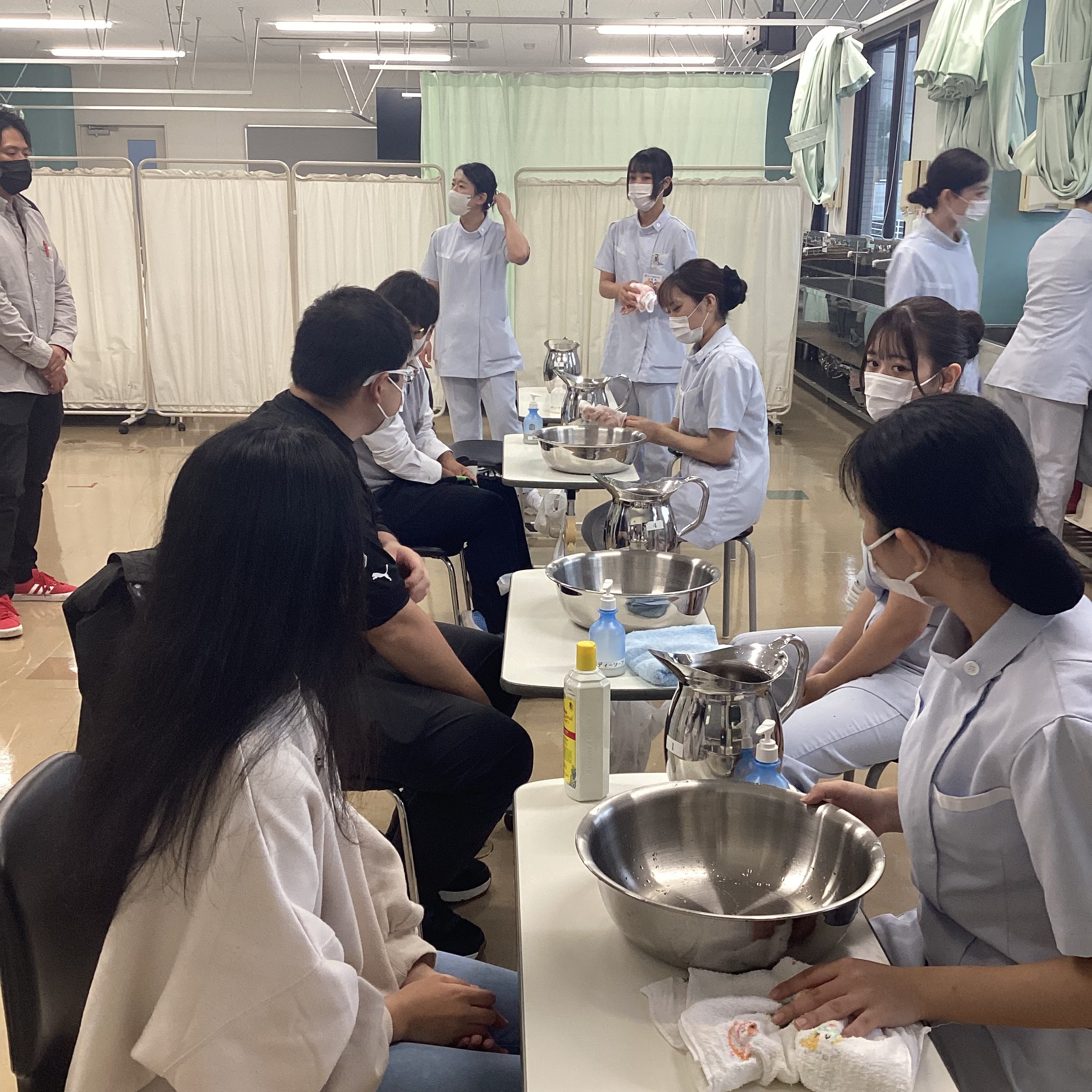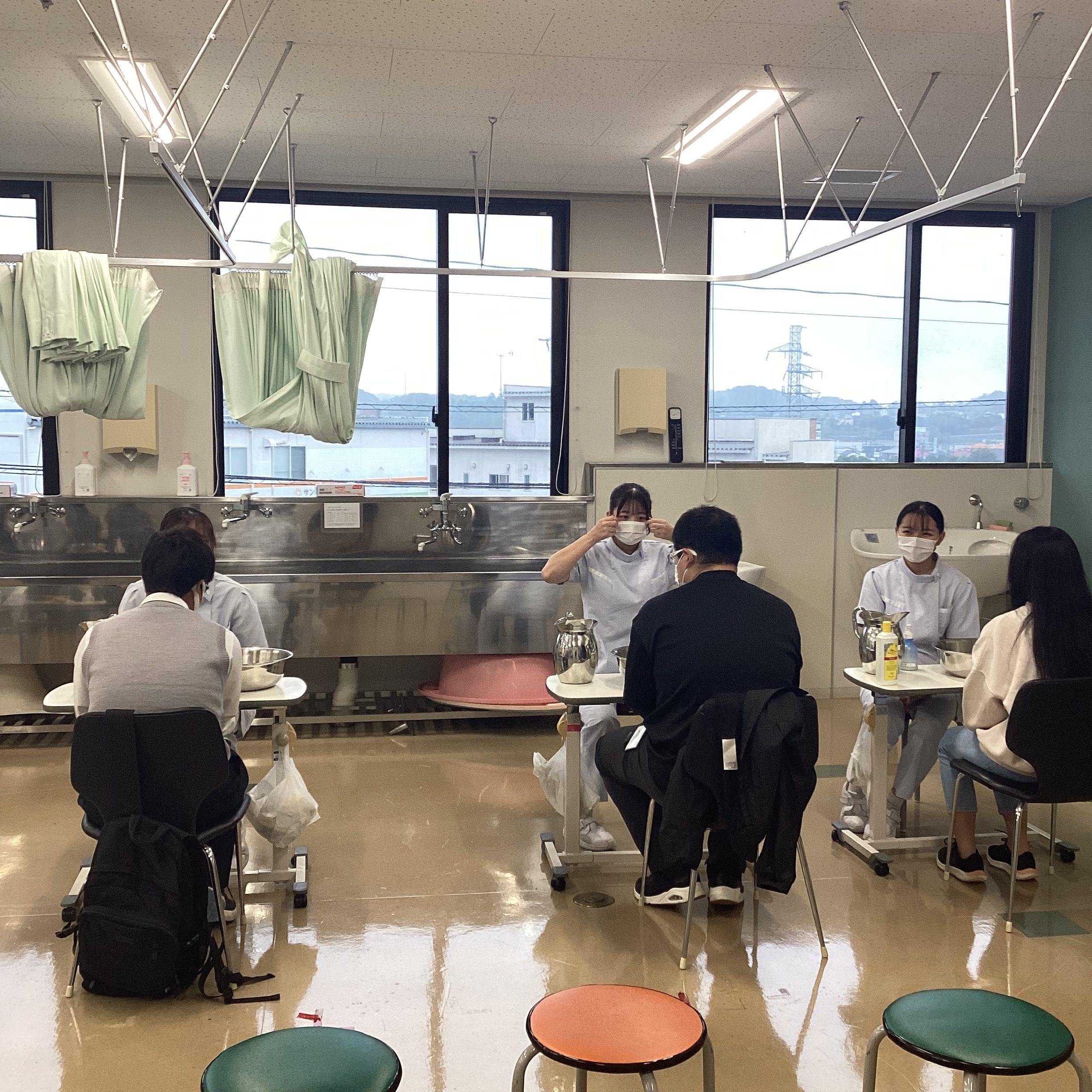 2階実習室では看護体験があり、手浴の看護技術を体験。